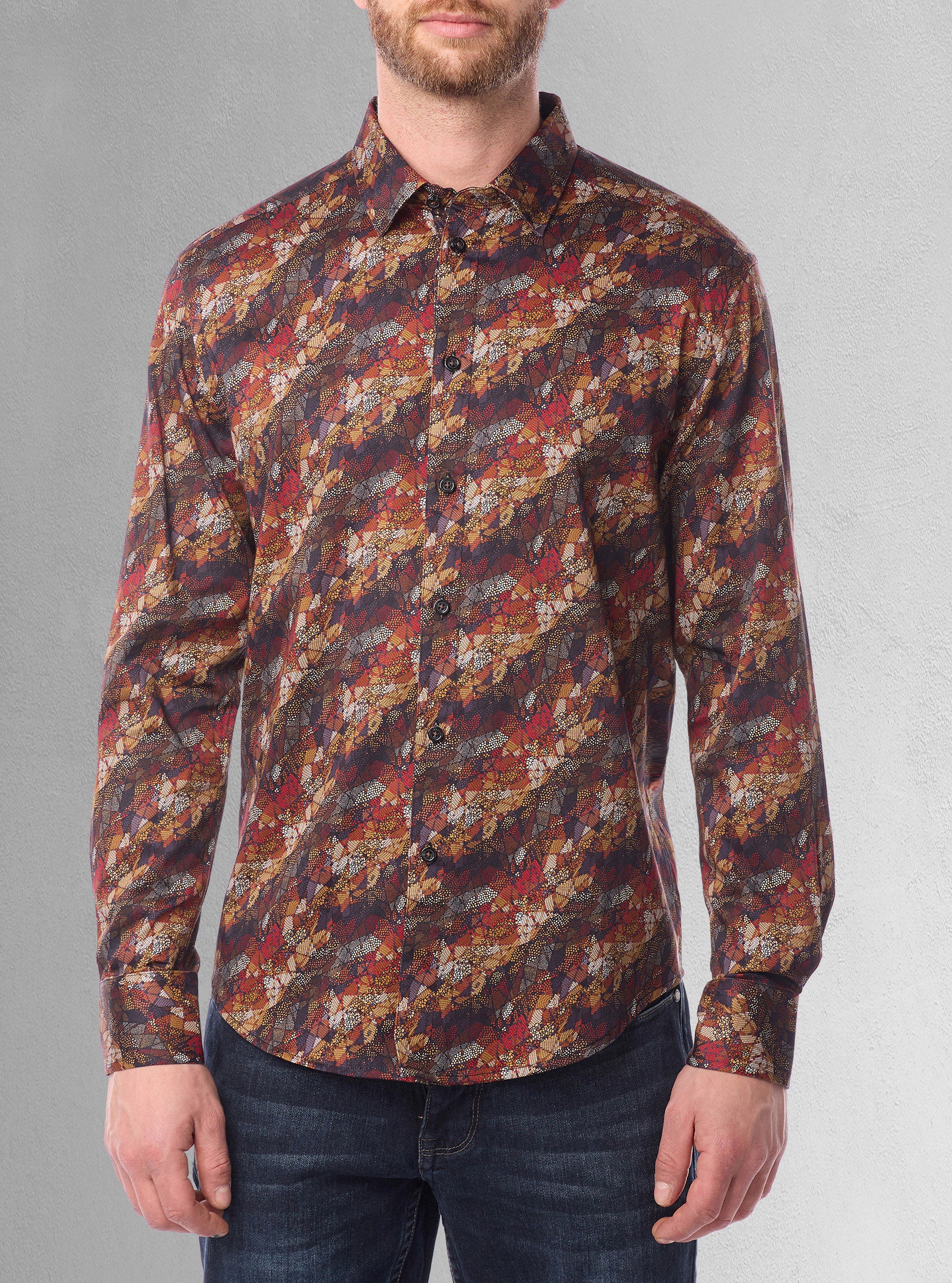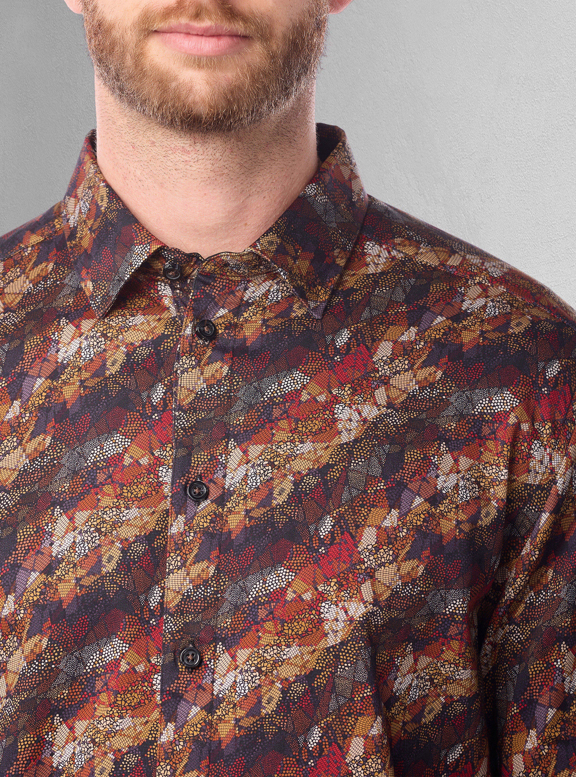 Cette chemise à manches longues pour homme est fabriquée en coton mercerisé extensible avec un imprimé ondulé distinctif et des bordures contrastées. La coupe semi-ajustée ajoute une touche de sophistication au design.